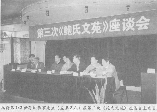 鲍氏在全国人中不少,虽排不上最大姓氏之列,但也称得是显姓,历代名人辈出。这次聚会,名为“《鲍氏文苑》座谈会”,显然是对鲍氏族史的研究和汇集。近年来,系谱研究已成一门学问。对一个家族的研究,不仅能搞清这一家族的发展演变,而且也可为社会学、人口学、民俗学等研究提供素材,是一件有益于社会的好事。我们姒姓,虽人数极为稀少,许多人不识“姒”字,但其历史久远。我和我叔父,正在探索姒姓的历史发展和现状,准备写书出版。这次参加座谈会,正是一次学习观摩的好机会,定能得益借鉴。还望今后多联系赐教。