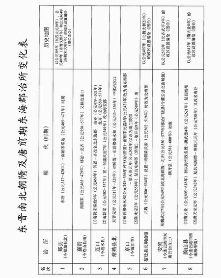 在东晋南北朝混乱的地方行政管理体制和设置的情况下,各国政权设置和侨置的“东海郡”的“治所”也变更频繁。现根据《辞海》[注1]、《中国历史地名大辞典》[注2]、[注3]和((中国历史地图集》[注4]、[注5】等提供的资料,将“东海郡”的“治所”的变化情况列表介绍如下: